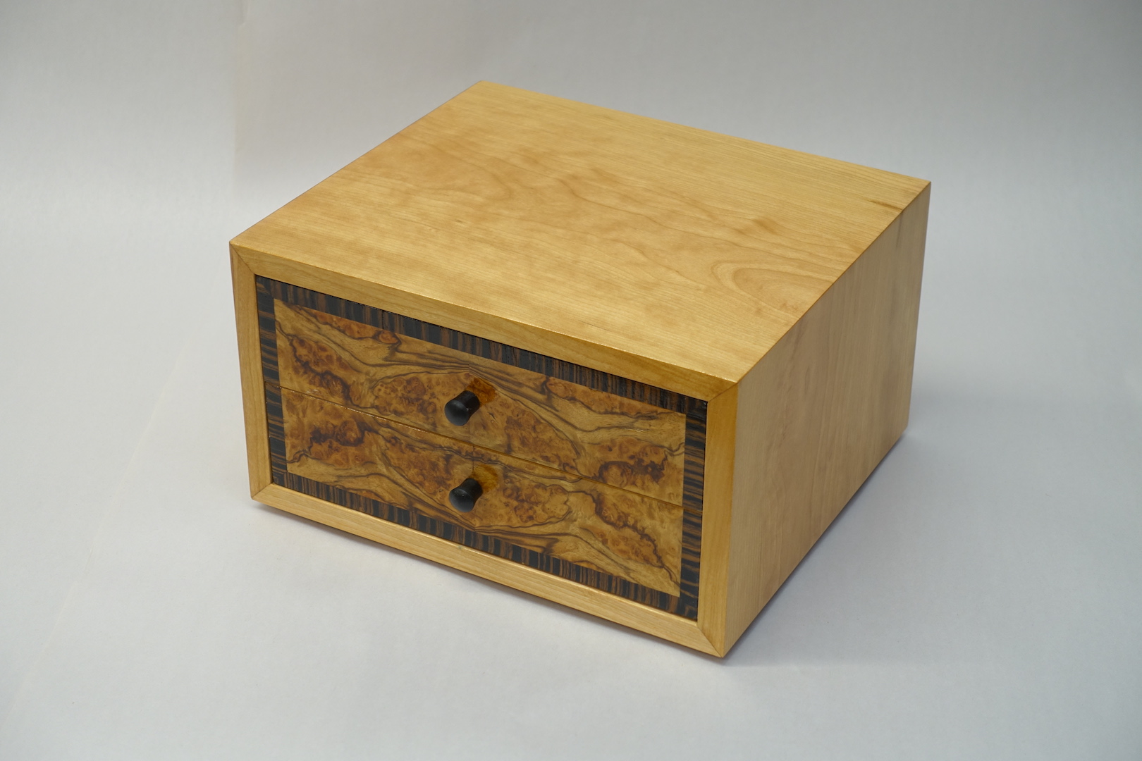 A pair of drawer boxes, designed for holding make-up, brushes and accessories. The cases for both are cherry, the lighter drawers are pepperwood burl and the darker ones are walnut burl. All the drawers are lined with suede. I built these in 2023.