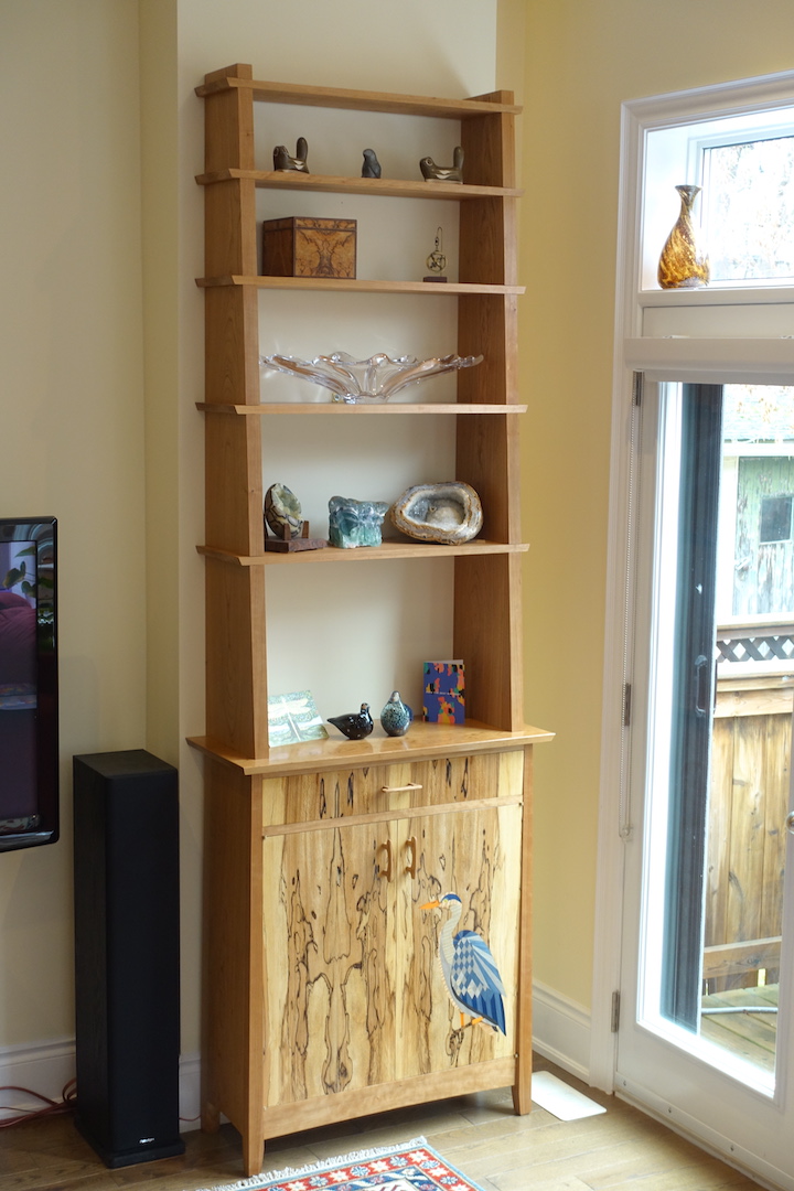 I call this my heron cabinet. It is the first time I tried to incorporate parquetry into my marquetry, I find it gives the feathers a neat abstract look. I think it pairs well with the spalted beech background on the doors, the spalting reminds me of heat lines and reeds coming out of a marsh on a hot day. The rest of the cabinet is cherry. Both sides taper towards the top across their width. This cabinet can easily stand on its own, but I built a shelf unit to sit on top and add a bit of extra display. I built this piece in 2024.