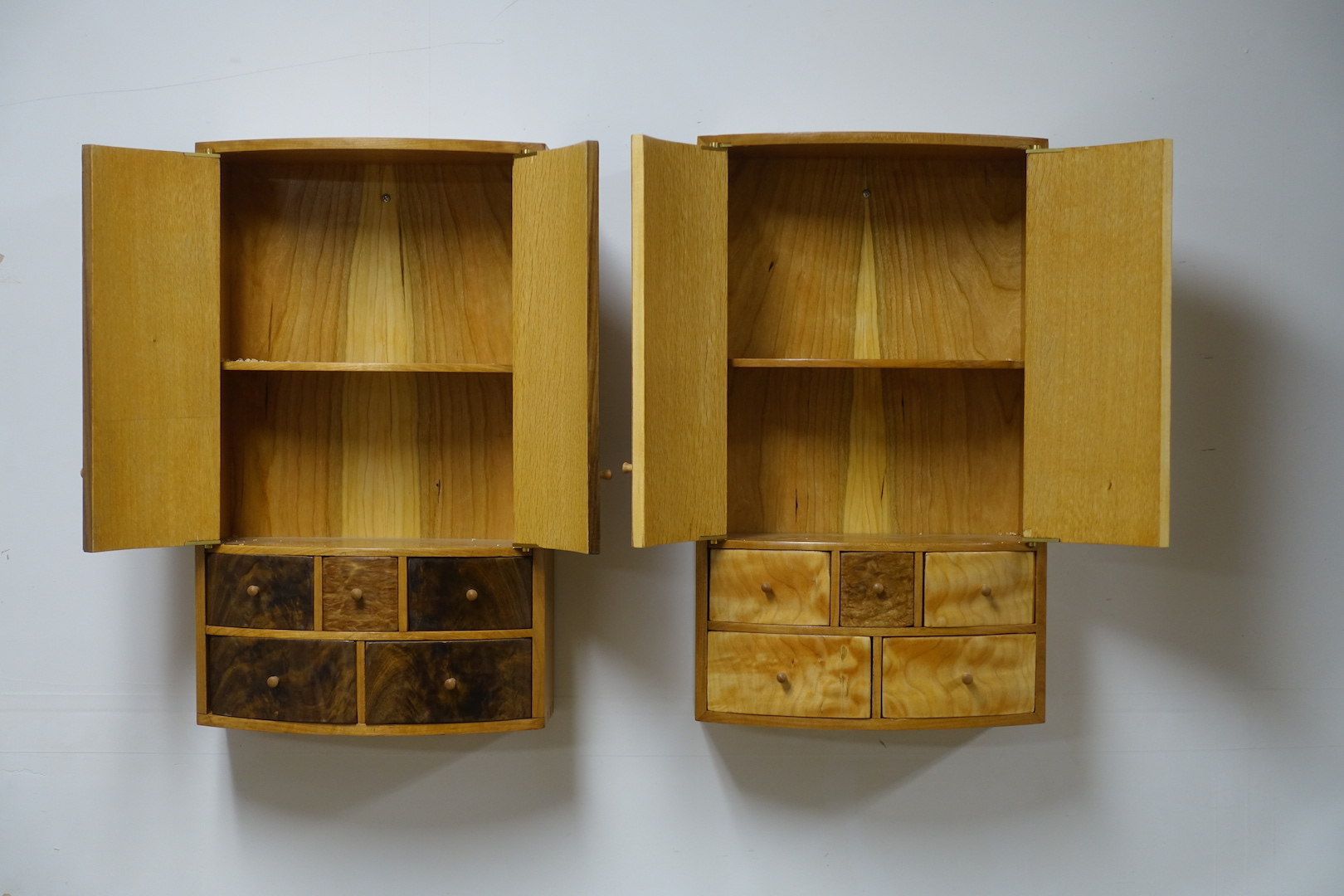 I built a matching, but different pair of curved front wall cabinets, these are a Matt Kenney design featured in Fine Woodworking. Both are built from riftsawn cherry, but feature different fronts and joinery. The darker one is walnut crotch and uses hand cut dovetails as the joinery. The lighter one is quilted maple and uses mitres for the joinery. These cabinets took way longer than I was anticipating, the number of glue ups with the bent laminated doors, drawers and the veneering was astounding. Fitting the curved drawers and doors was also quite a bit more challenging than their rectilinear counterparts. The maple cabinet is hanging in my entryway and the walnut was a housewarming gift for a close friend. These were completed in August 2017.